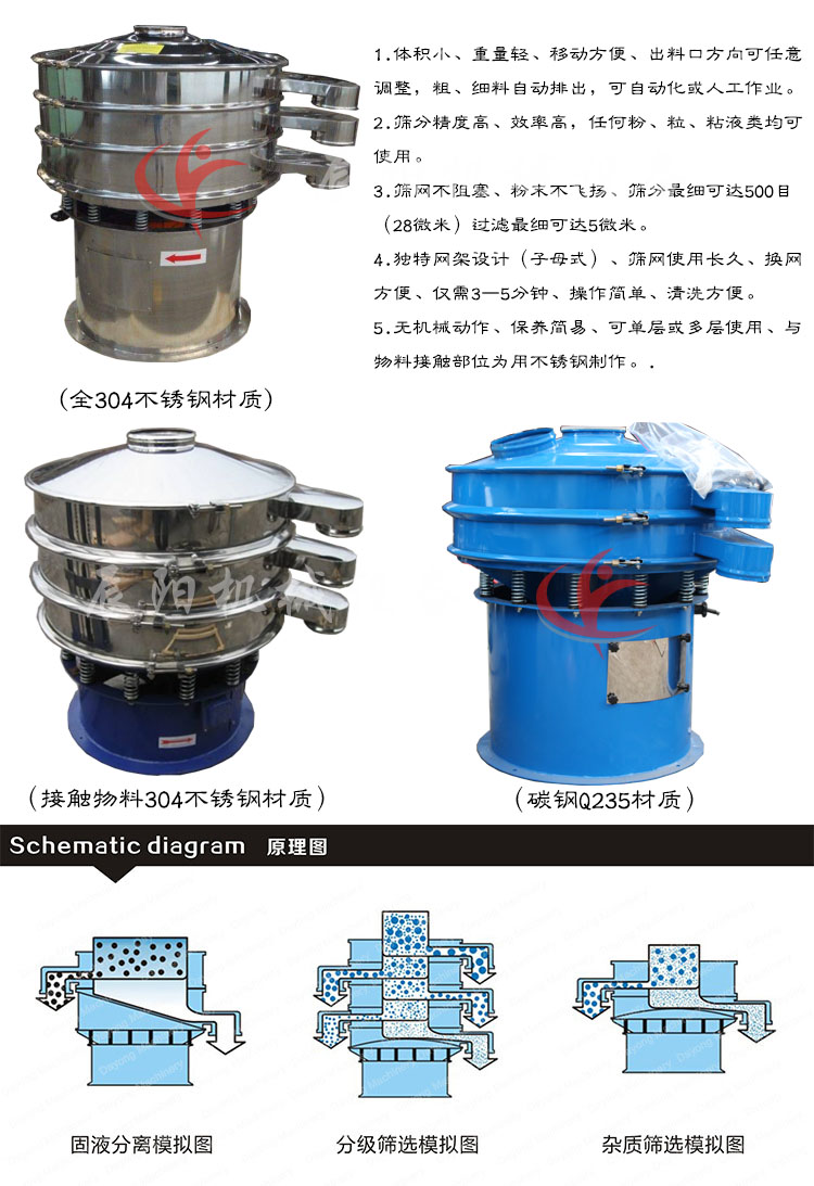 超聲波振動(dòng)篩是將220v、50HZ或110v、60HZ電能轉(zhuǎn)化為38KHZ的高頻電能,輸入超聲換能器,將其變成38KHZ機(jī)械振動(dòng),從而達(dá)到**篩分和清網(wǎng)的目的。改系統(tǒng)在傳統(tǒng)的振動(dòng)篩基礎(chǔ)上再篩網(wǎng)上引入一個(gè)低振幅、高頻率的超聲波振動(dòng)波(機(jī)械波)在篩網(wǎng)上面疊加一個(gè)高頻率低振幅的超聲振動(dòng)儀,超微細(xì)粉體接受巨大的超聲加速度,使篩面上的物料**保持懸浮狀態(tài),從而抑制粘附、摩擦、平降、等堵網(wǎng)因素。解決了強(qiáng)吸附性、易團(tuán)聚、高靜電、高精細(xì)、高密度、輕比重等篩分難題,使超細(xì)微粉篩分不再難事,特別適合高品質(zhì)、精細(xì)粉體的用戶使用